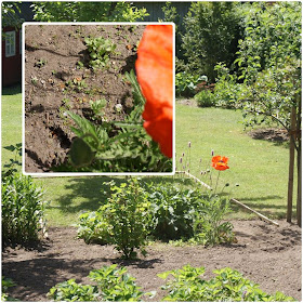 Jeg må indrømme, at vores have er ret grøn. Sagt på en anden måde, så er der fint og grønt, men der ikke ret mange blomster. Men jeg vandt en frøpose hos Claus Dalby, og jeg kan se der (lige bag den store valmue) kommer små fine valmueplanter op. Så måske der bliver "blomstret" alligevel i haven år.